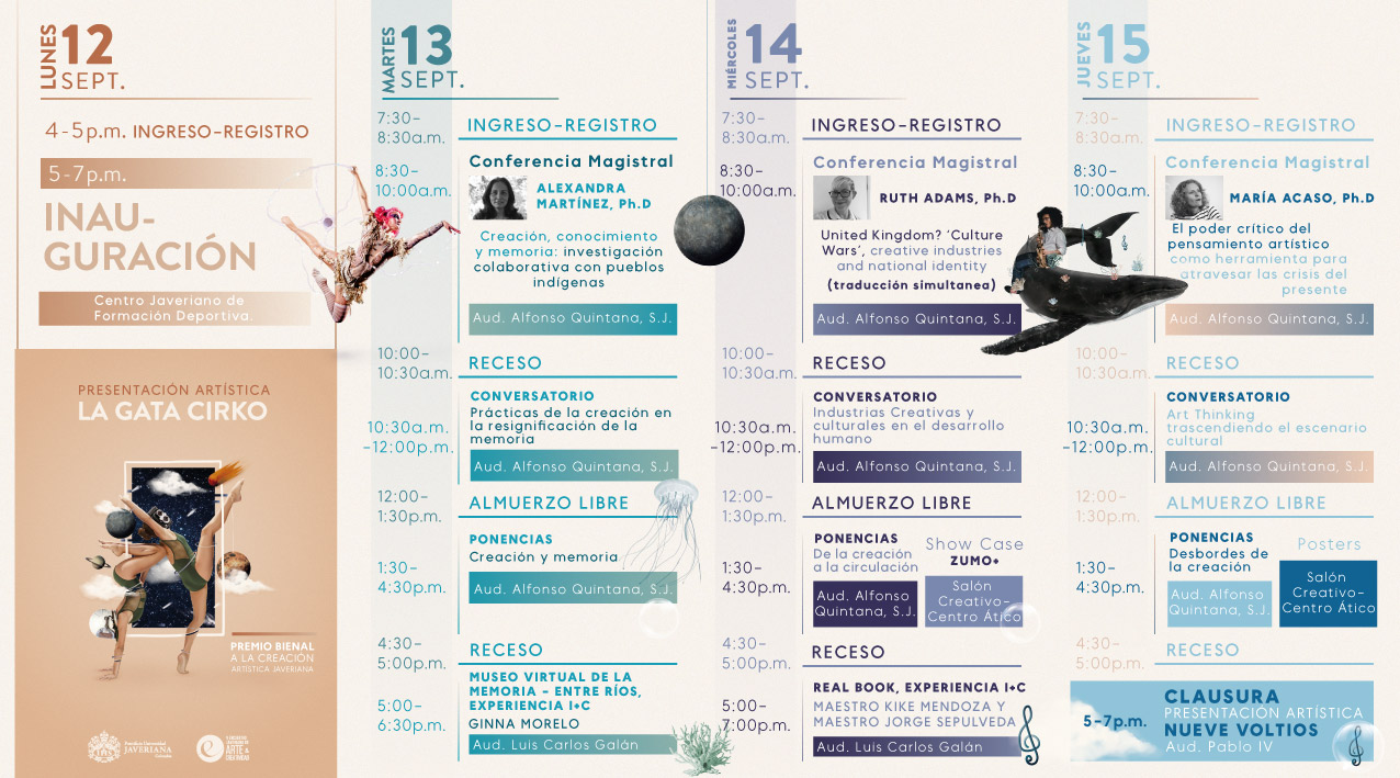 El evento, que para esta ocasión se realizará de manera presencial, reunirá 41 creadores, 33 expertos y 22 obras en diversas actividades como presentaciones artísticas, conversatorios, ponencias, posters y una exposición de arte. En estas participarán profesores, egresados, estudiantes y personas reconocidas en el medio, que aportarán sus reflexiones y conocimientos en diversos temas como: creación y memoria, creación y circulación y desbordes de la creación.